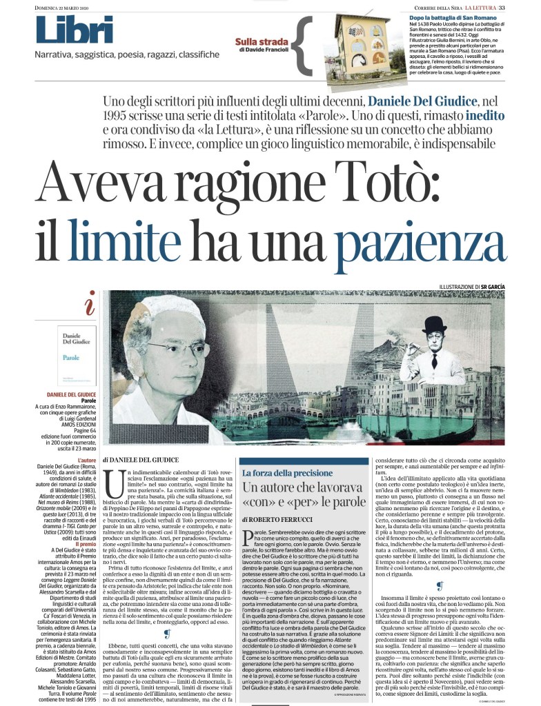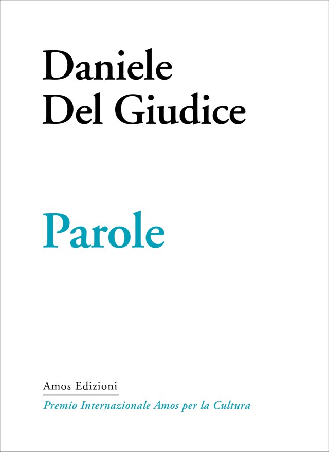 Parole di Daniele Del Giudice contiene tre inediti: Io, Novità, Limite. E’ pubblicato in un’unica edizione fuori commercio, quindi non è in vendita, ed è legato al Premio Internazionale Amos per la Cultura e al Convegno “Leggere Daniele Del Giudice”.